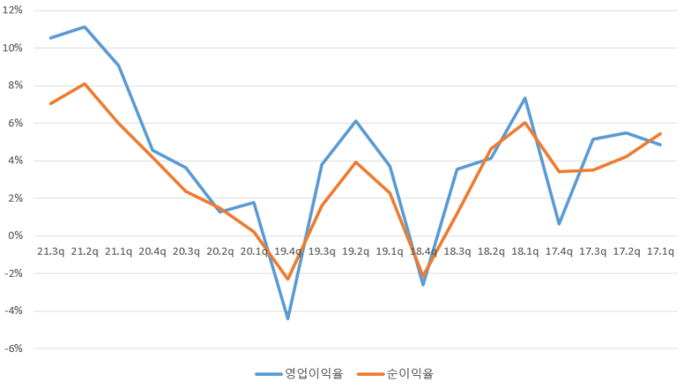 작년까지 바닥을 기던 영업이익률도 올해는 11%까지 올라온 상태입니다.