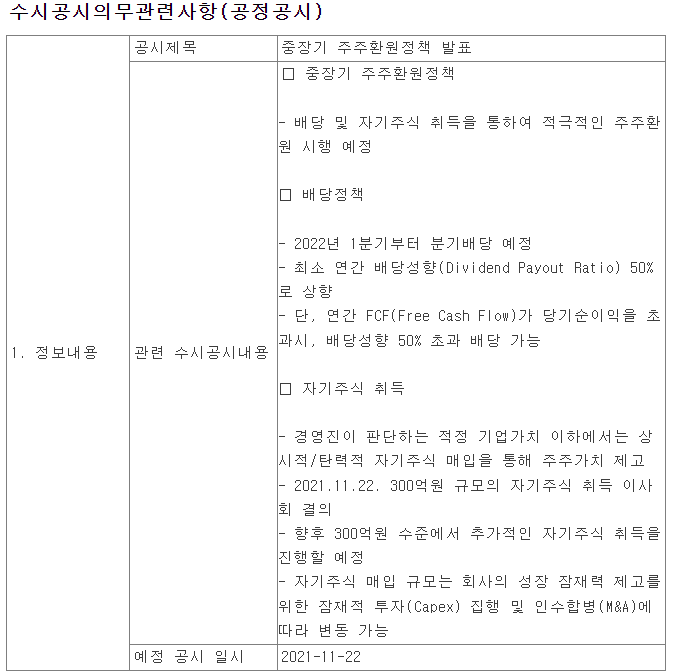 배당성향 50% (대충 2021년 순이익 컨센이 833억이니 따져보면 주당 2,400원 정도 배당이 가능하네요. 그럼 배당율이 약 2.6%!!)