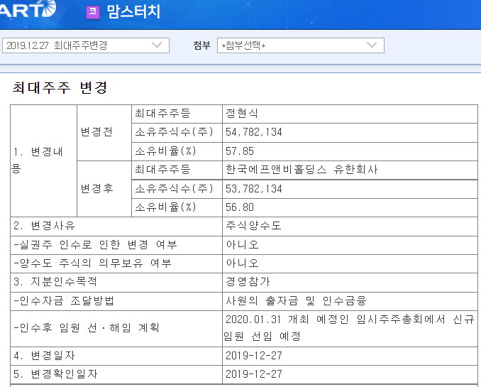 2019년 12월에 한국에프앤비홀딩스가 맘스터치 지분 56.8%를 주당 3,500원에 인수합니다.