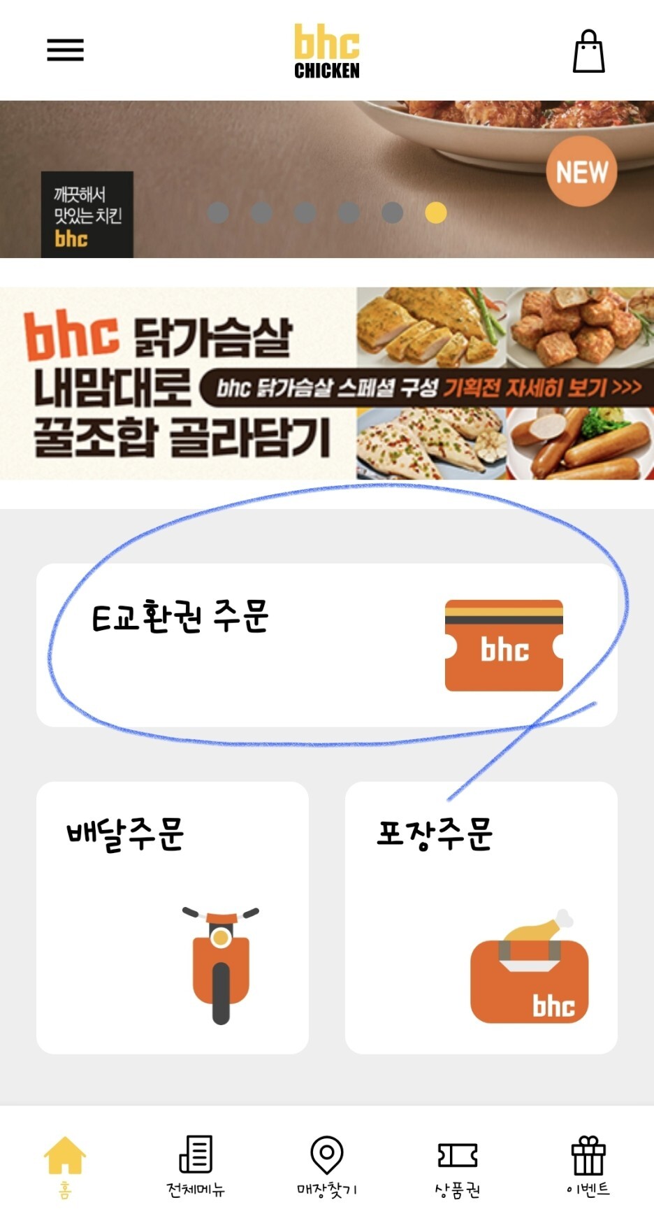 앱을 열고 E교환권 주문을 찾아서 눌러줍니다.