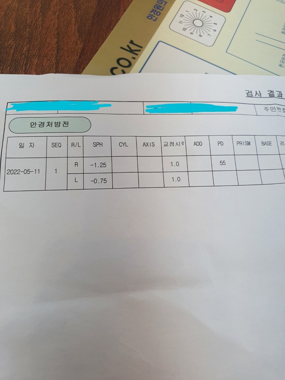 위쪽이 눈높이 안과에서 새로받은 안경처방전