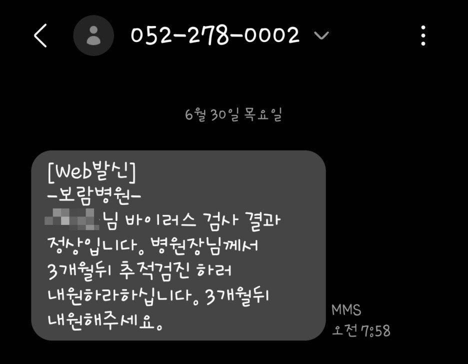 진료 후 6일째되는 날 아침에 병원에서 문자가!!