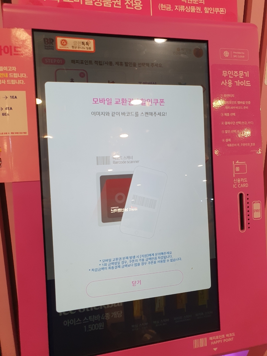 바코드를 인식시키면 이렇게 사용할 교환권이 떠요.
