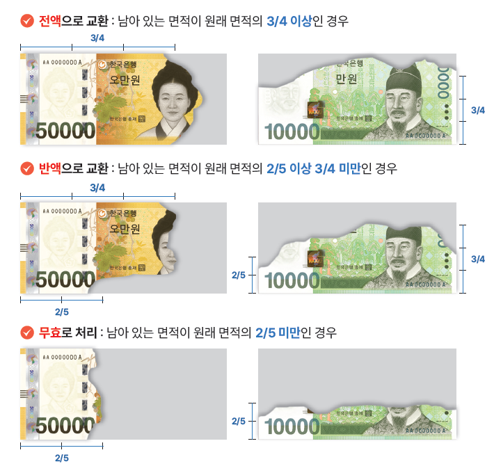 갑작스런 화재나 세탁, 세단 등으로 인해 지폐가 손상되었을 때,