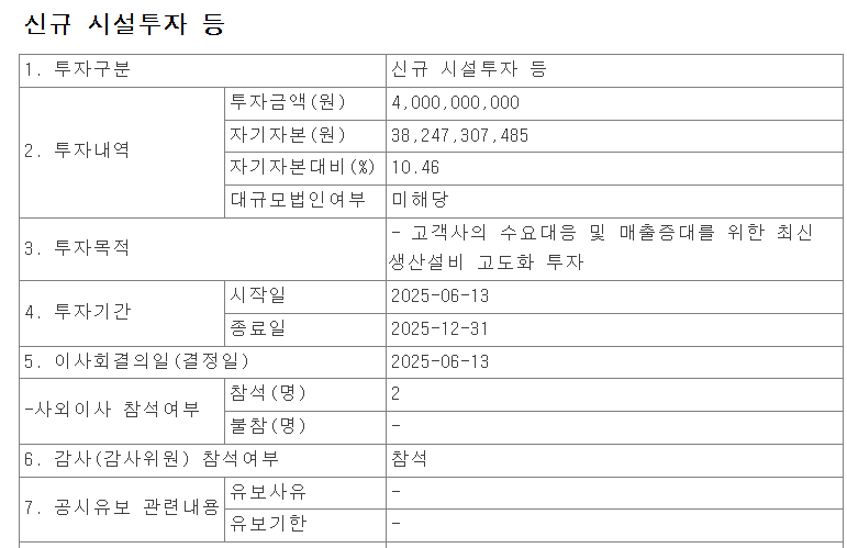 – 고객사 수요에 맞춘 설비 확장은 매출 증가에 직접 연결될 가능성이 높습니다. - 제조 경쟁력 강화