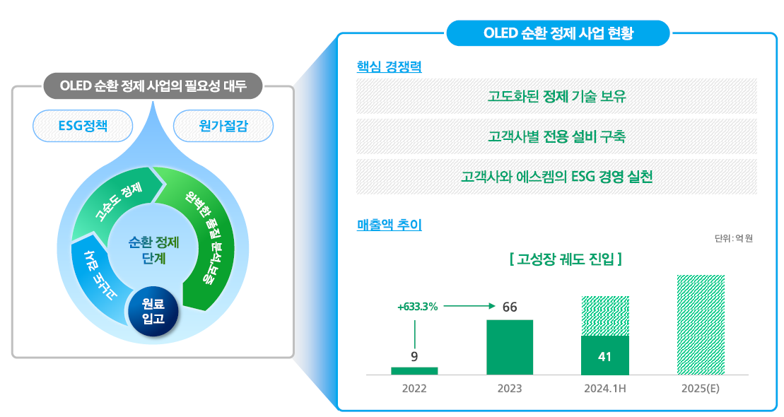 OLED 순환 정제는 단순 친환경 사업을 넘어, 에스켐의 실적 성장을 견인하는 핵심 성장 축으로 자리 잡고 있습니다.