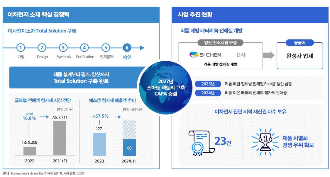 에스켐은 전해질 첨가제뿐 아니라, 리튬메탈·전고체 배터리 전해질 개발까지 진입하며 에너지 소재 포트폴리오를 강화하고 있습니다.