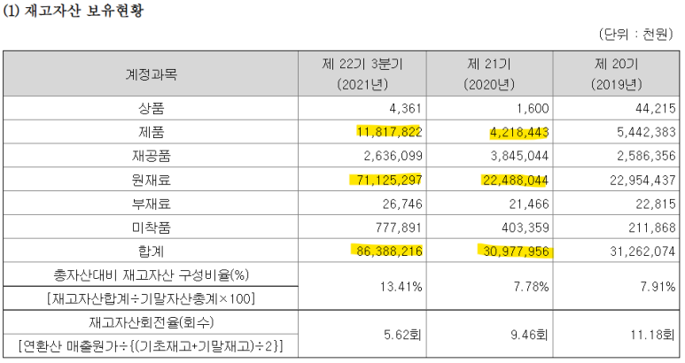 아무튼 내년에는 좋아진다는 의미 같은데.. 이번 3분기 재고 자산을 보니 2020년 말 대비 거의 3배 가까이 증가했습니다. 회사가 기업 설명회를 통해서 준비하고 있는 부분이 많다고 했으니 악성재고가 아니겠죠??