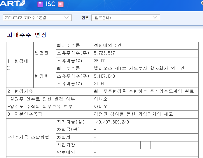 헬리오스PE는 올해 7월 ISC의 지분 31.6%를 주당 28,736원에 인수하였습니다.